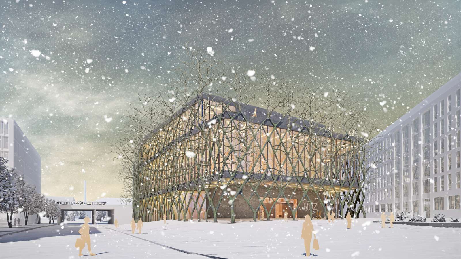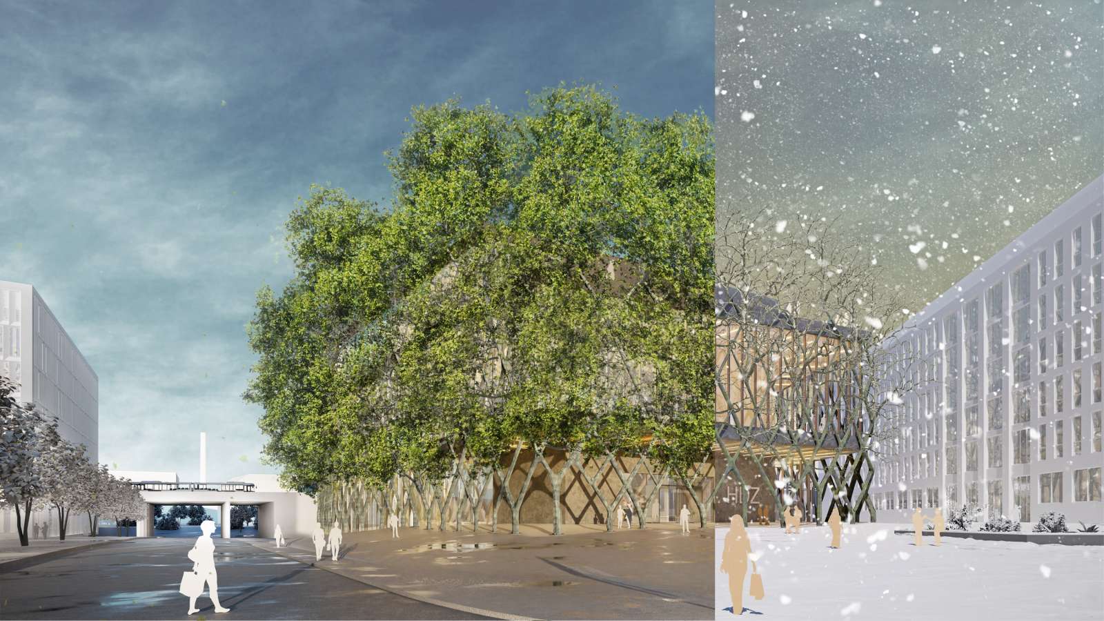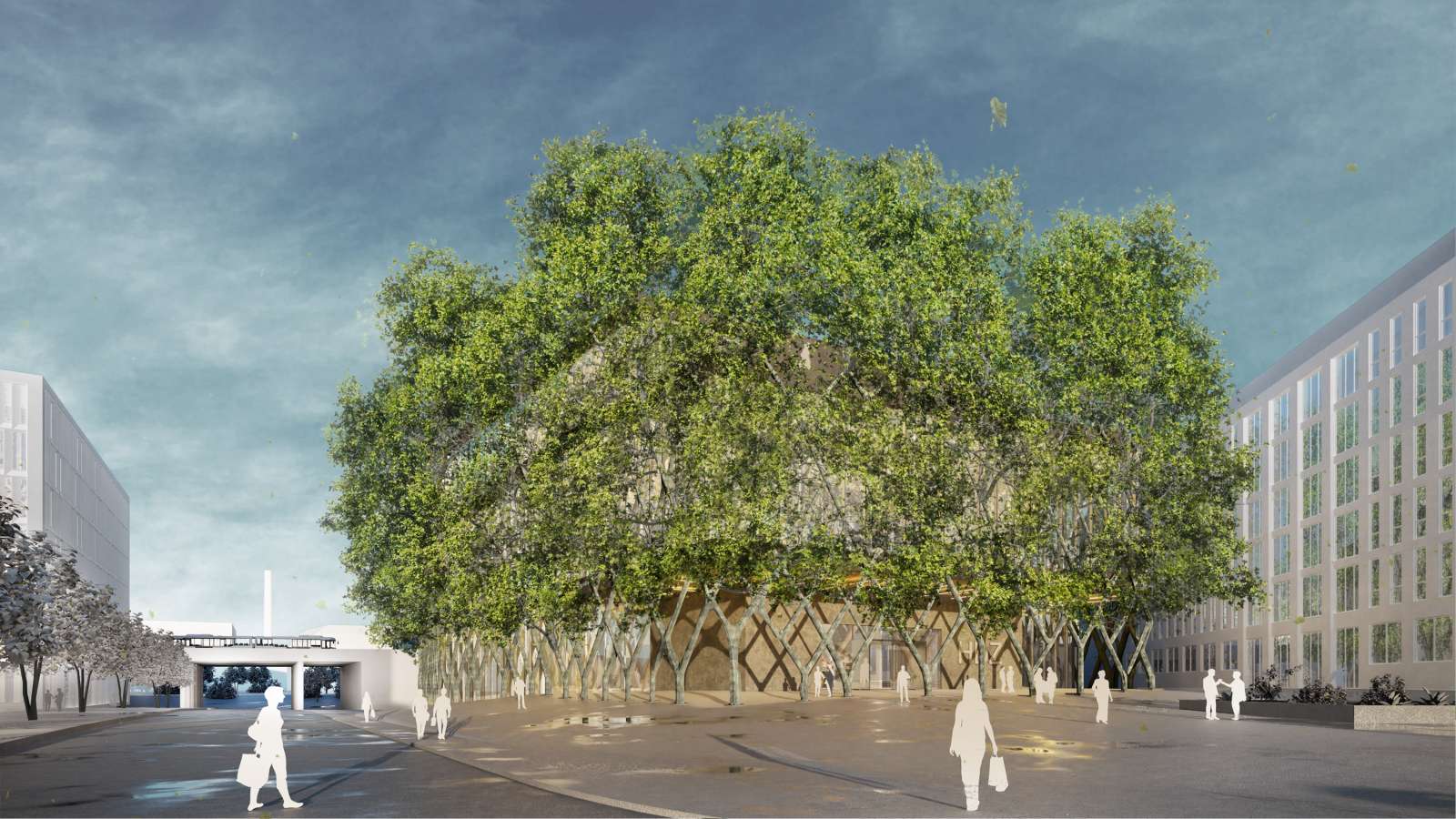 To the outside, facing the city, the building presents itself as a large, artificially formed tree. Inside, the rooms are arranged concentrically: Along the tree-glass façade, a wide ramp winds upwards as the main access. In this outer layer, the visitors find themselves at different heights in a treetop and thus in a natural space that stands in great contrast to the exhibition rooms. These, structured as themed galleries and islands, are located in the solidly built core of the building, which also accommodates all other uses.