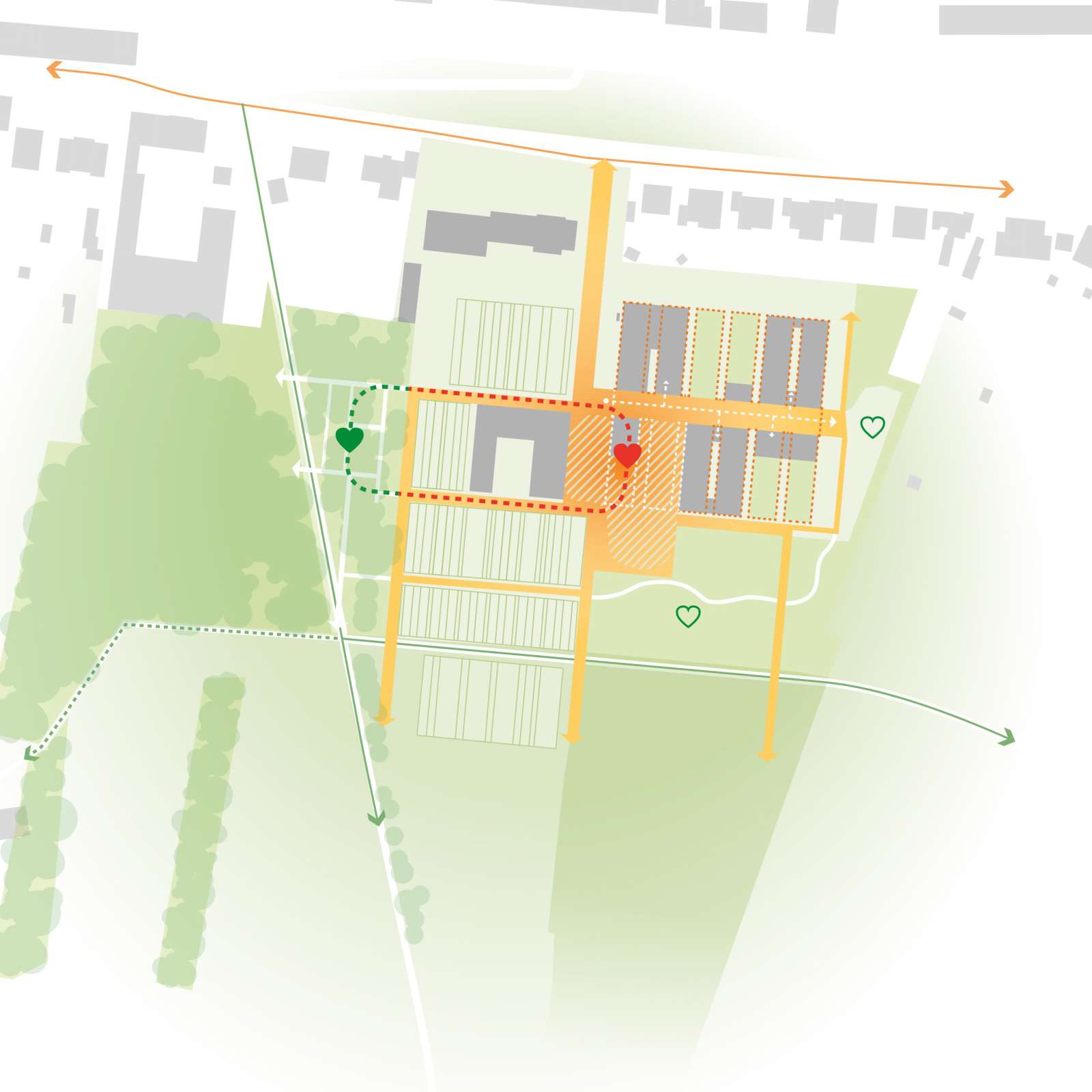 Die städtebauliche Struktur knüpft bewusst an den Bestand an und entwickelt dessen bauliche und landschaftliche Qualitäten weiter. Die vorhandene urbane Wildnis wird erhalten, differenziert weiterentwickelt und durch neue Nutzungen ergänzt. So entsteht ein Freiraumsystem mit hoher ökologischer Vielfalt und vielfältigen Aufenthalts- und Begegnungsmöglichkeiten – von offenen Gärten und Plätzen bis zu gemeinschaftlich genutzten Gewächshäusern als überdachte Freiräume.